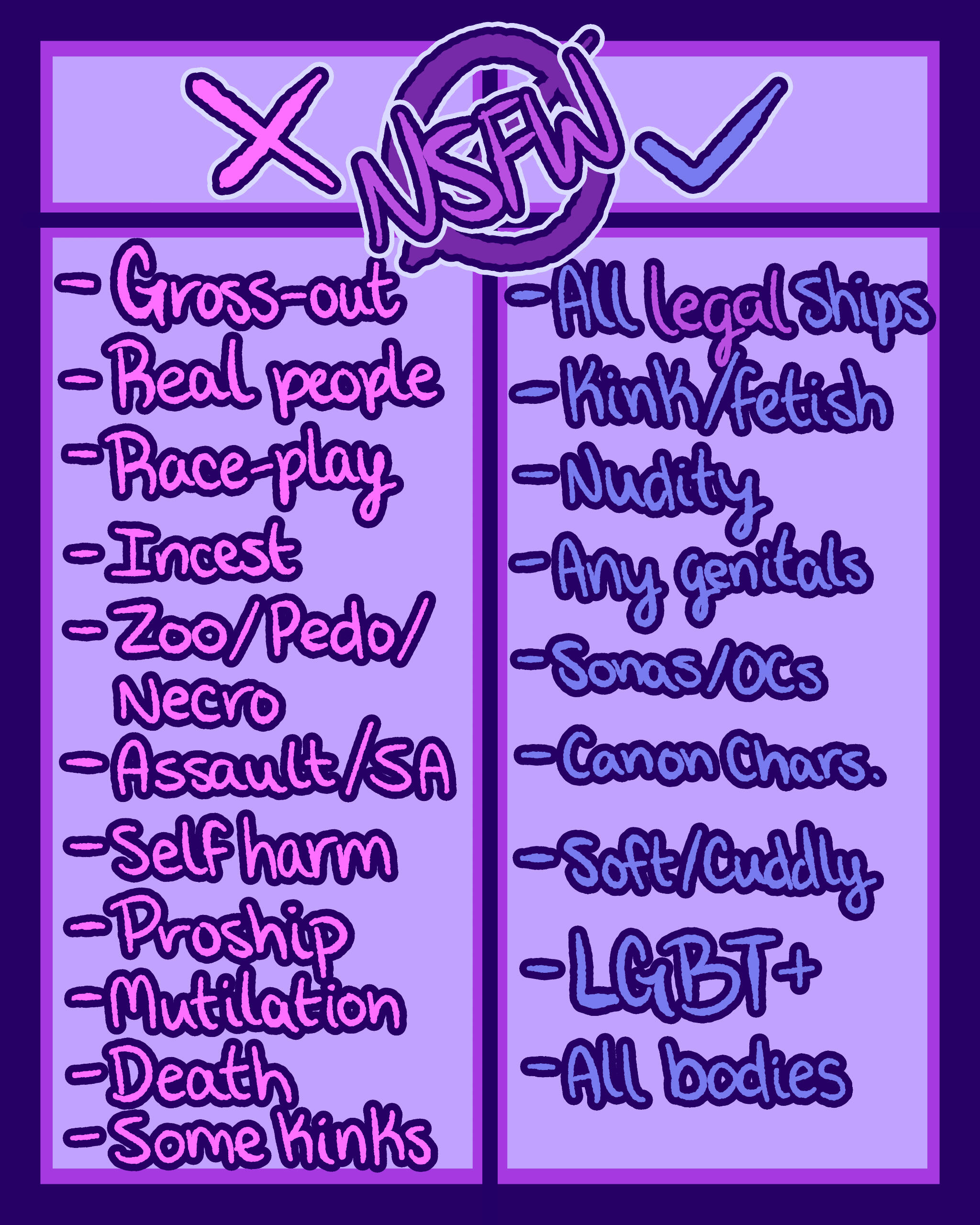 - NSFW art can only be commissioned by contacting me directly.- Minors are NOT allowed to commission NSFW artwork from me. If you are found to be under 18 and you are attempting to commission me for something NSFW, I will report, block, and entirely blacklist you.I will also privately inform other artists of your actions so that they will not be impacted as well.Your money will not be refunded and the artwork will be discarded.